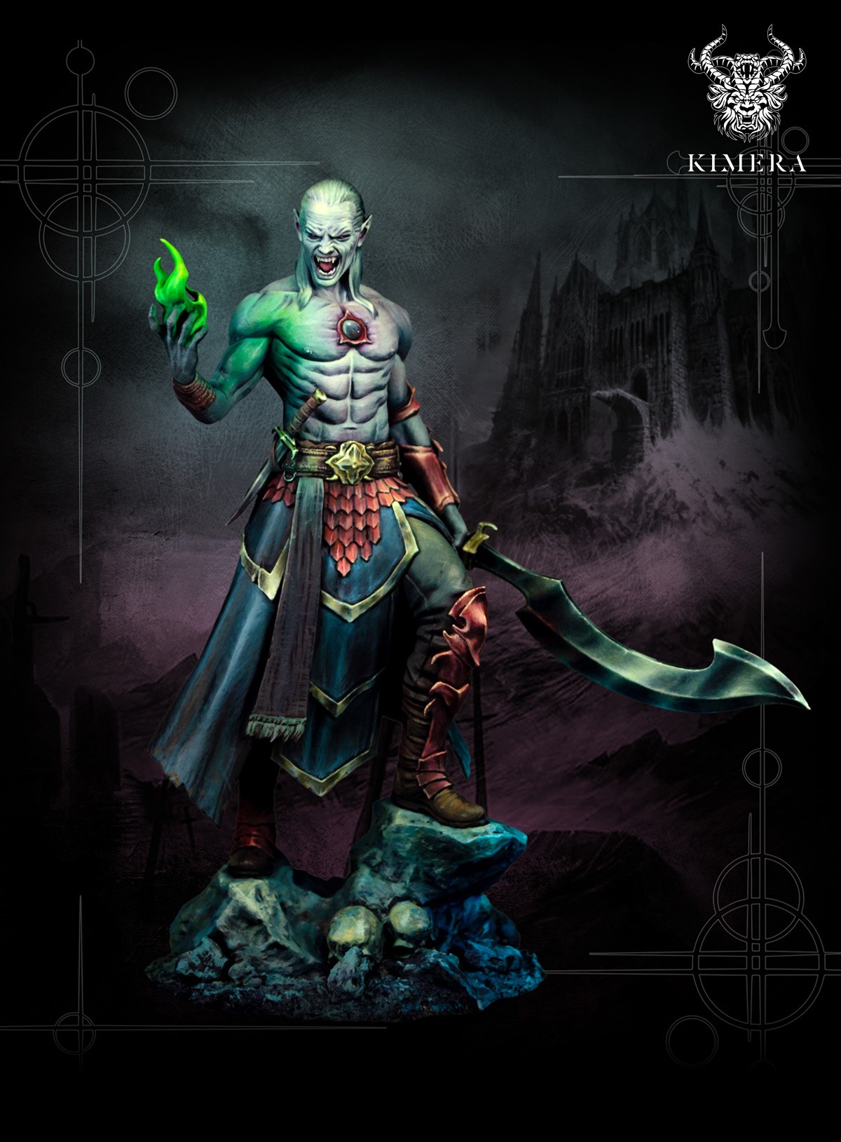 Grigore is a 75mm vampire warlock miniature from Kimera Models’ TENEBRAE: Gothic Fantasy range, sculpted in high quality resin for ambitious display painters. Fangs bared and cloak swirling, curved blade ready while green or crimson witchfire burns in his outstretched hand. The exaggerated anatomy, sharp facial features and pose make him an ideal subject for dramatic lighting, eerie ambience and bold colour choices on both skin and cloth.