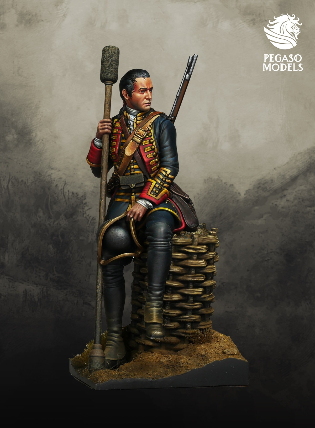 Crisp sculpted details on lapels, lace, belts and equipment give painters plenty of opportunities for controlled edge highlights, subtle texture and non metallic metals. The relaxed but alert pose makes this Royal artillery gunner an ideal storytelling piece, whether used as a standalone display or combined with other Seven Years War figures to build a larger battery scene. The gabion and earthwork base provide natural volumes for pigments, dust and spent powder effects without overwhelming the figure.