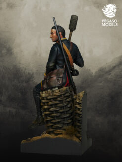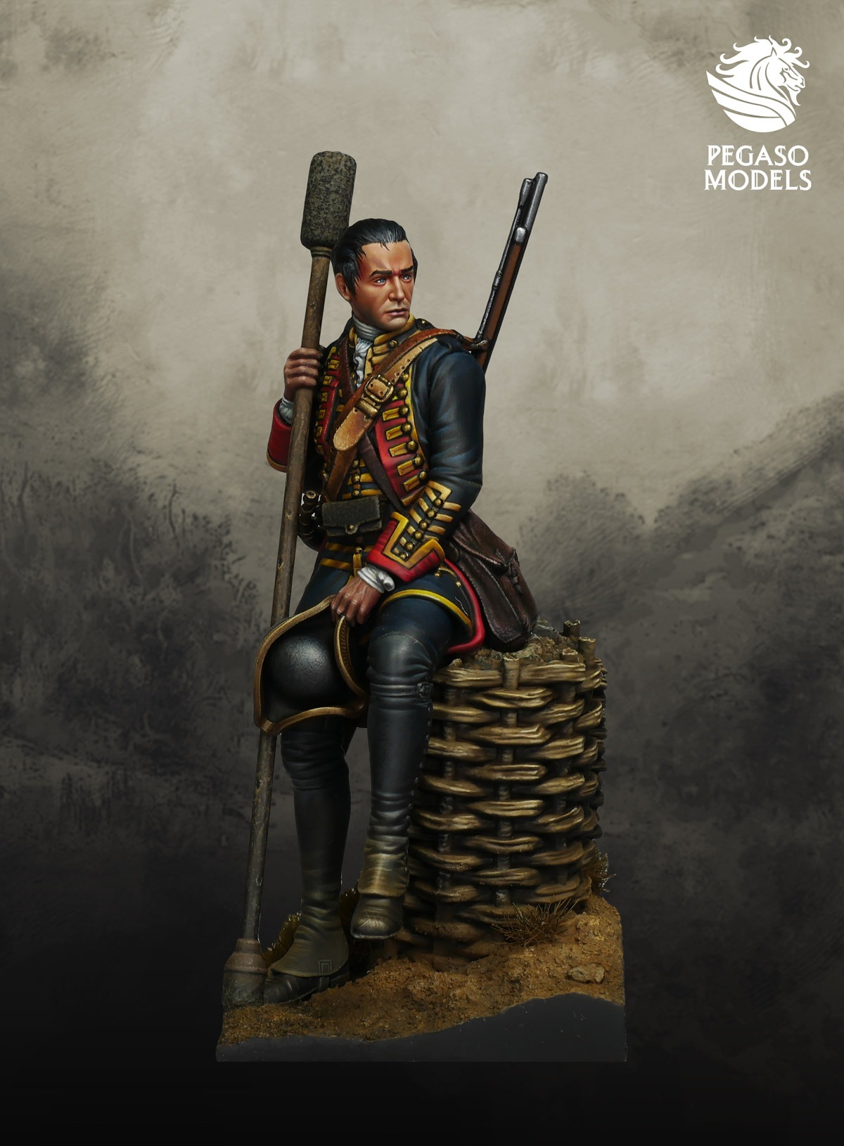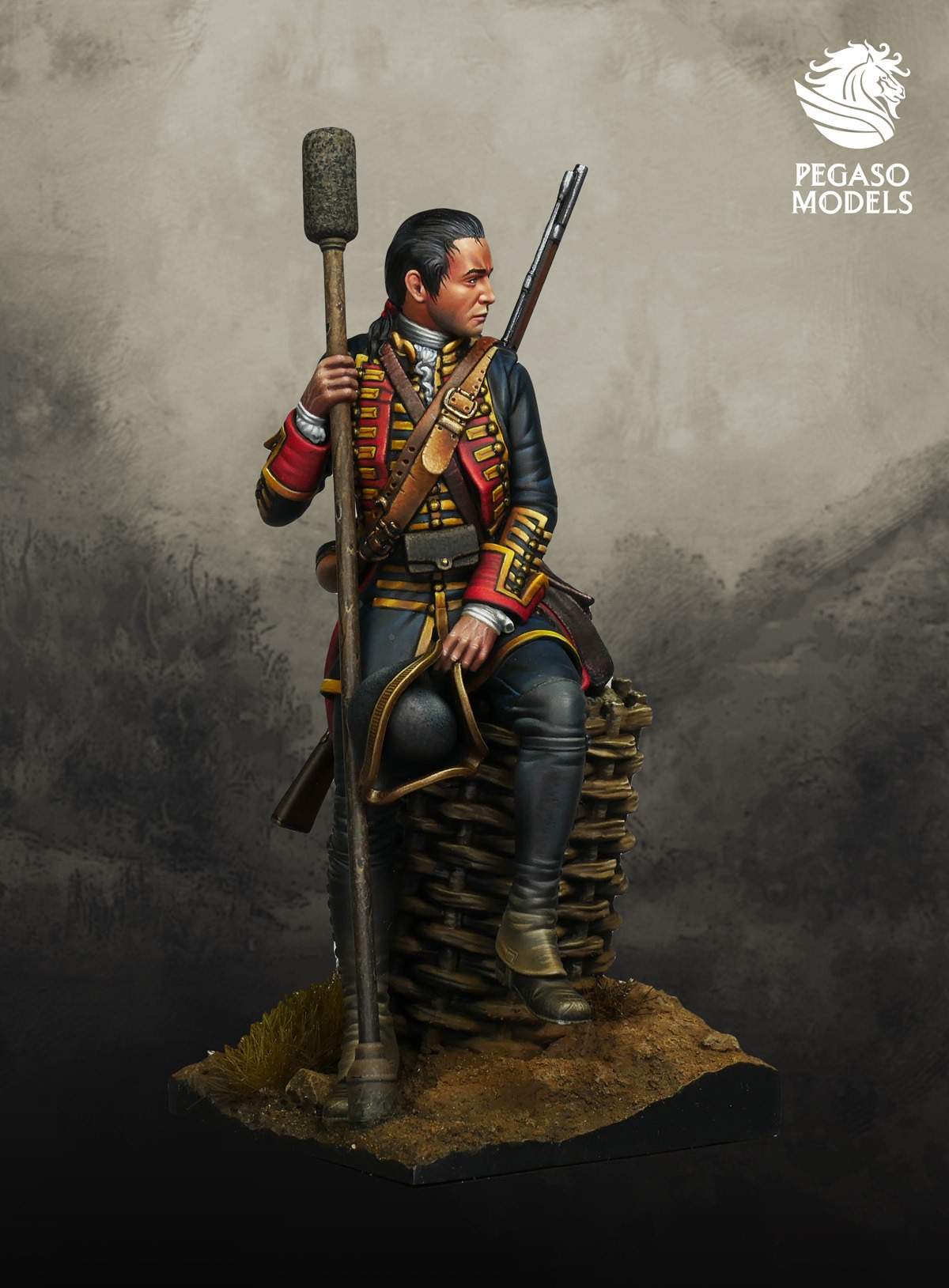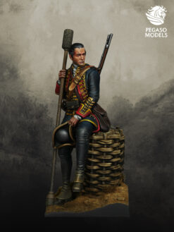Pegaso Models presents this 75mm Royal artillery gunner, a private of the Royal Regiment of Artillery at the Battle of Minden in 1759. Cast in high quality resin, the figure shows the soldier resting on a wicker gabion between bombardments, sponge staff in hand and musket slung over his shoulder, ready to return to the guns at a moment’s notice. The dark blue coat with red facings, yellow lace and black gaiters reflects the distinctive colours associated with British artillery during the mid eighteenth century and ties the miniature directly to the famous Minden campaign. His expression invites careful work on skin.