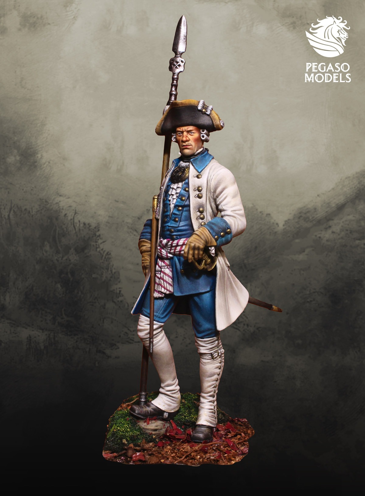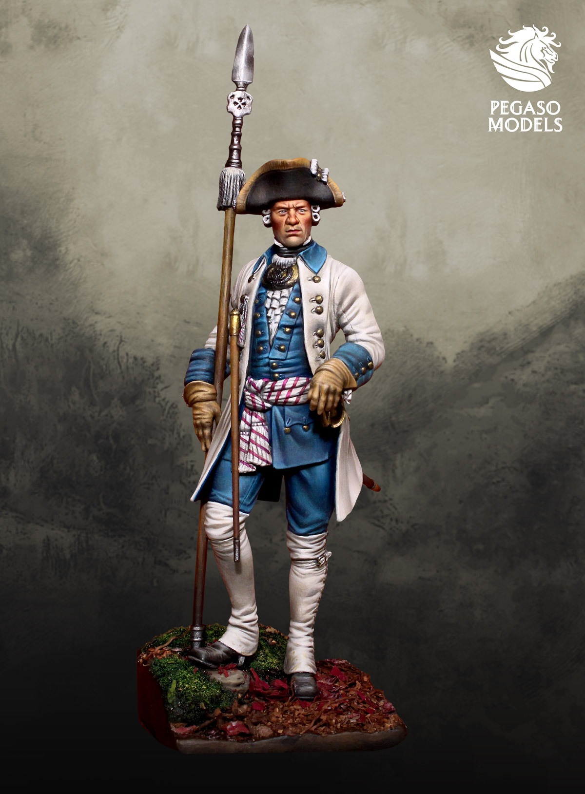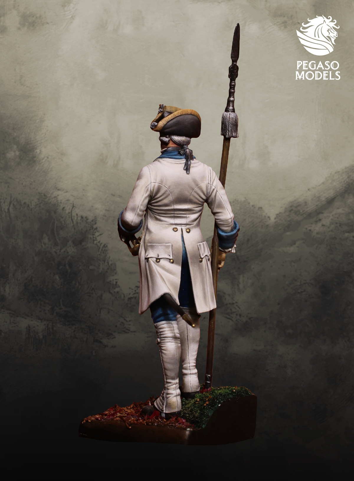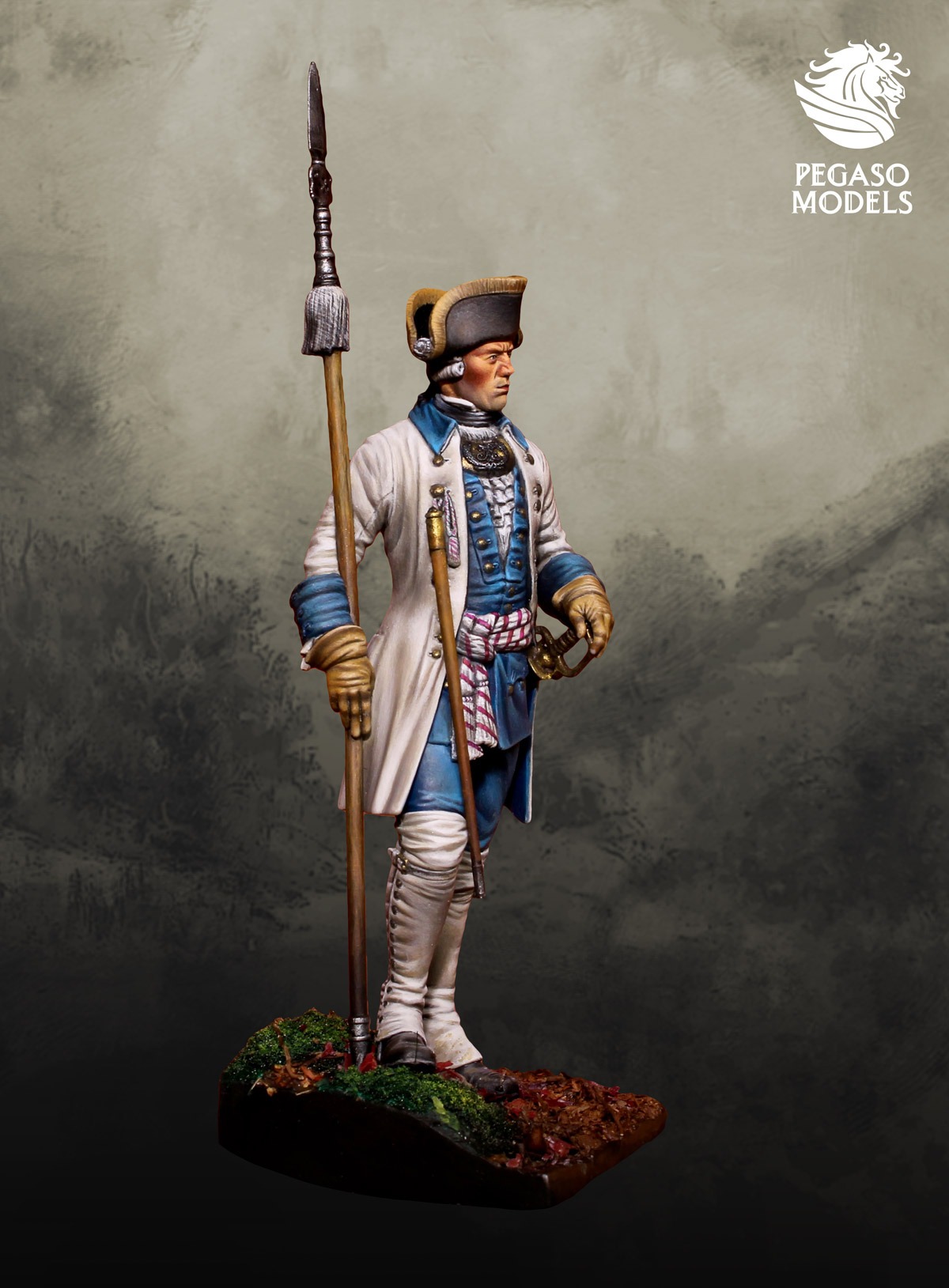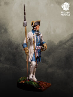 This captain sculpt emphasises crisp folds, clean buttons, lace and facial expression, giving painters all they need to explore subtle, carefully controlled light, fabric textures and weathering without sacrificing historical credibility. The 75mm scale makes the Saxon infantry captain large enough for competition level freehand and colour transitions, yet compact enough to fit in a display cabinet alongside other Pegaso Models subjects from the Seven Years War and eighteenth century Europe ranges. The dynamic yet composed stance also works well in dioramas depicting pre battle moments, field reviews or command scenes.